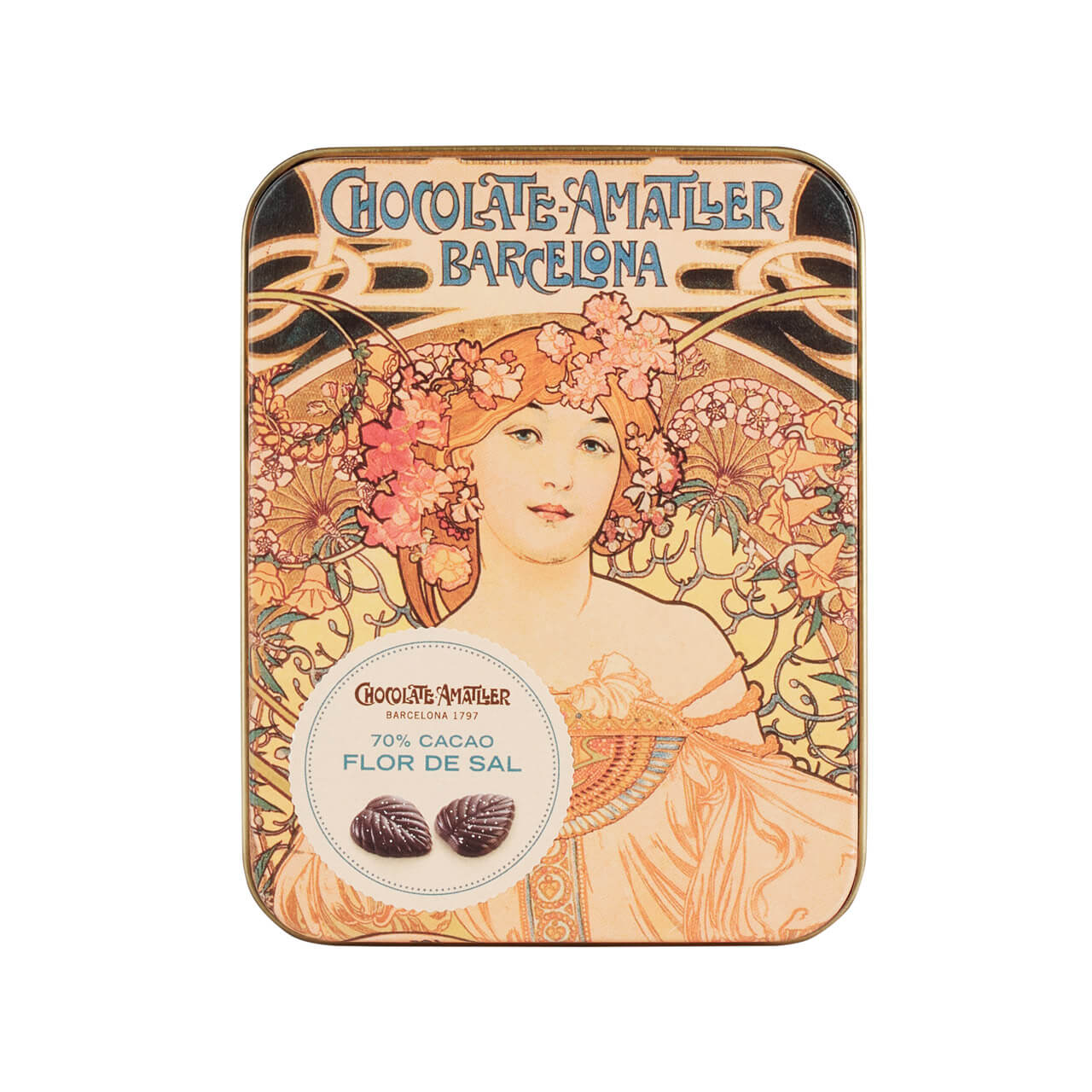 Delicious thin leaves of 70% cocoa chocolate with a touch of Mediterranean salt. They come in lovely tins decorated with a range of beautiful original art nouveau posters created for the supplier, Chocolate Amatller, in the early 1900s. Perfect for gifting and stocking fillers.