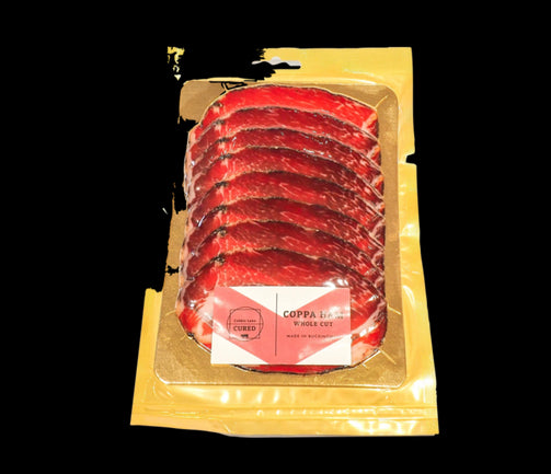 Coppa is made real slow! Giving it as much time in their chamber as possible, up to 5 months to mature. This gentle aging process allows it to develop slowly, avoiding overdrying and to generate a rich fruity flavour, and soft marbled texture.