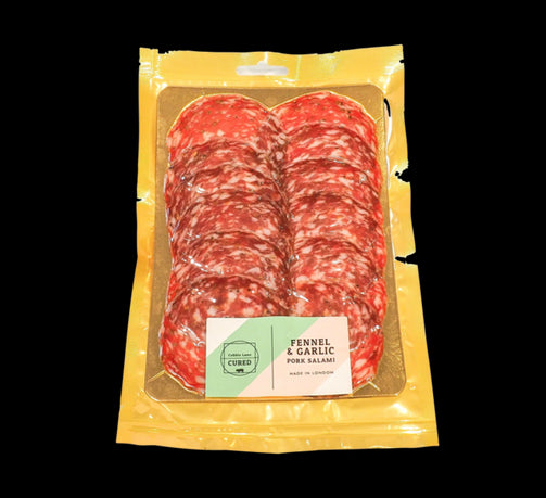 Sliced Fennel and Garlic Salami, take on the classic Italian Finocchiona, typical of the Tuscany region. Made from British pork, it has a fresh and clean fennel fragrance rounded out with a little red wine and garlic. Hung for at least 6 weeks for a moist subtle texture. This is a best selling salami.
