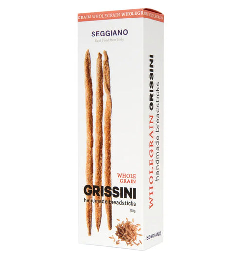 Grissini breadsticks are a perfectly crispy, classic appetiser from Piemonte, Italy. Seggiano crunchy wholegrain breadsticks are handmade by a family bakery, which has specialised in making artisan grissini since 1945. The dough is made using simple, authentic ingredients, hand rolled into their long, characteristic shape and then fast baked. A classic recipe using locally milled wholegrain flour and quality Italian extra virgin olive oil.