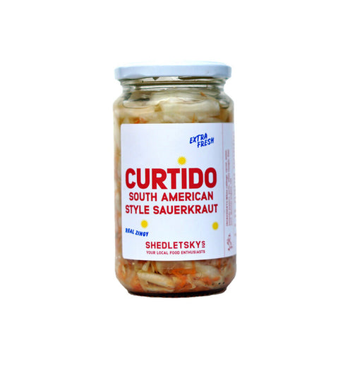 Think of it as a Central American sauerkraut. Shedletskys takes crisp white cabbage and ferment it for at least 18 days in a spicy brine packed full of lime and fresh chillies. Add Mexican oregano for a distinctive and addictive taste.